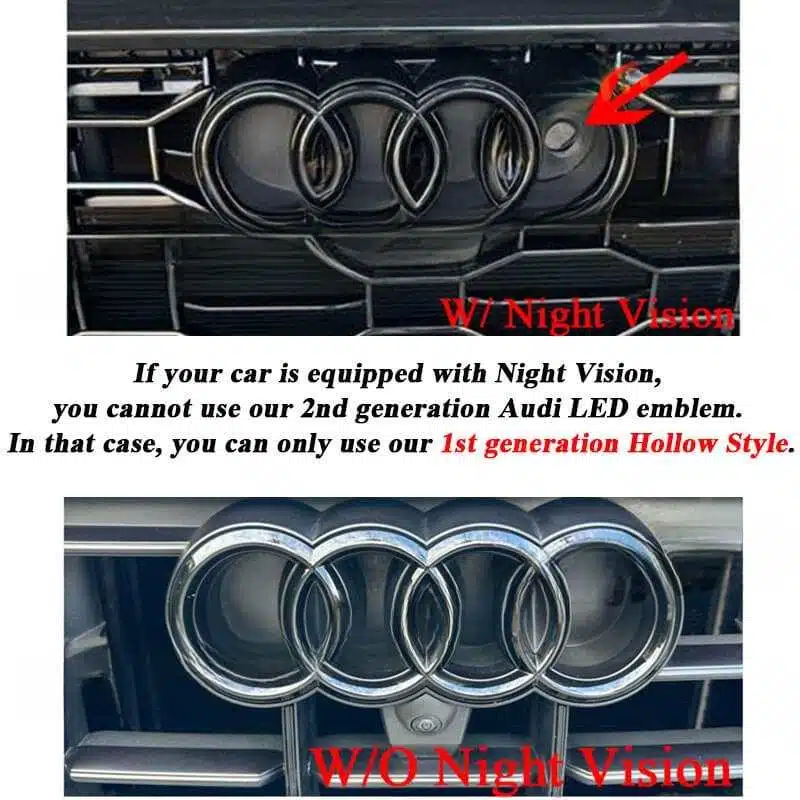 Important Note: Vehicles equipped with Night Vision are not compatible with the 2nd-generation Audi LED emblem. For these models, only the 1st-generation Hollow Style emblem is suitable.